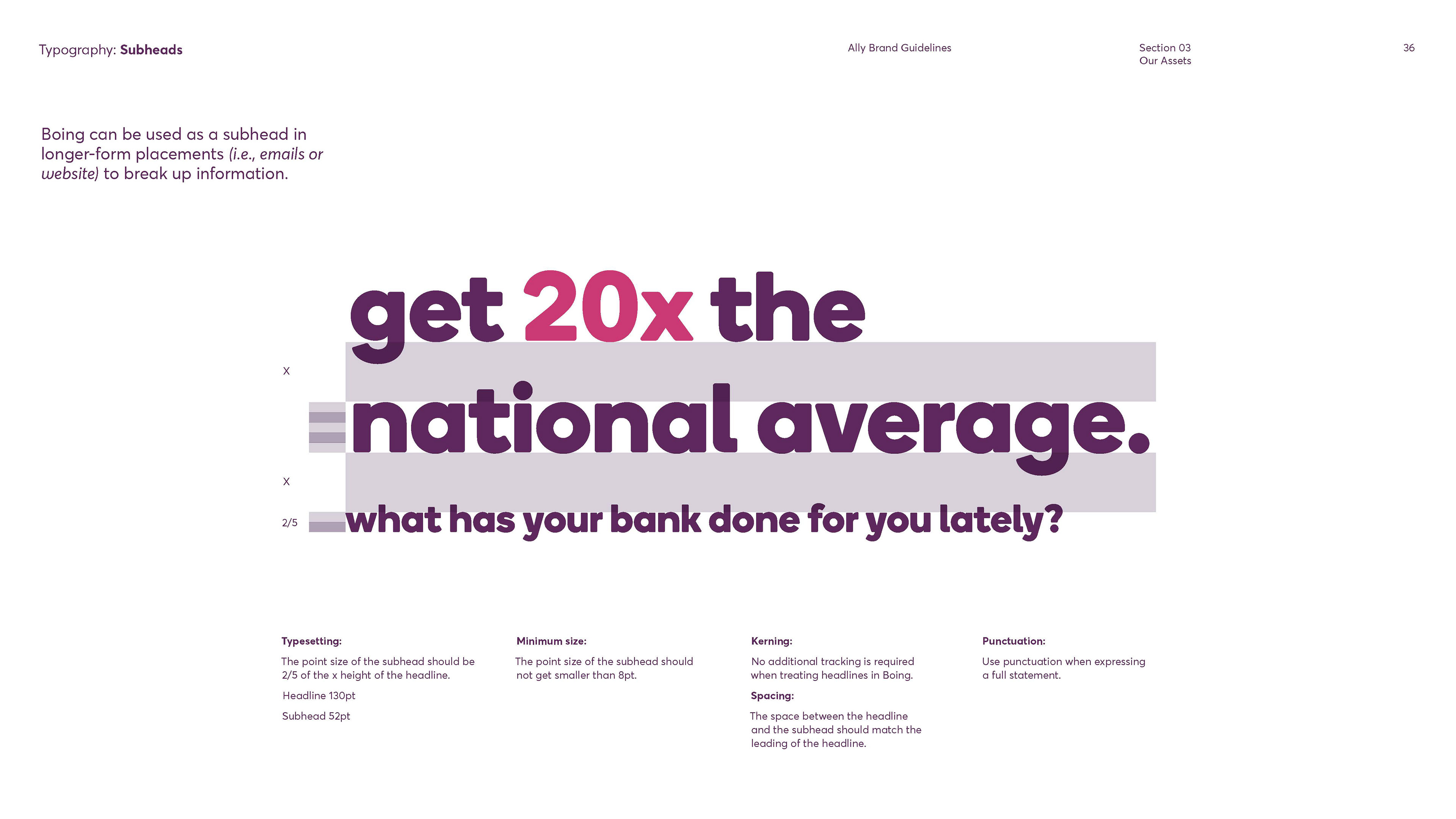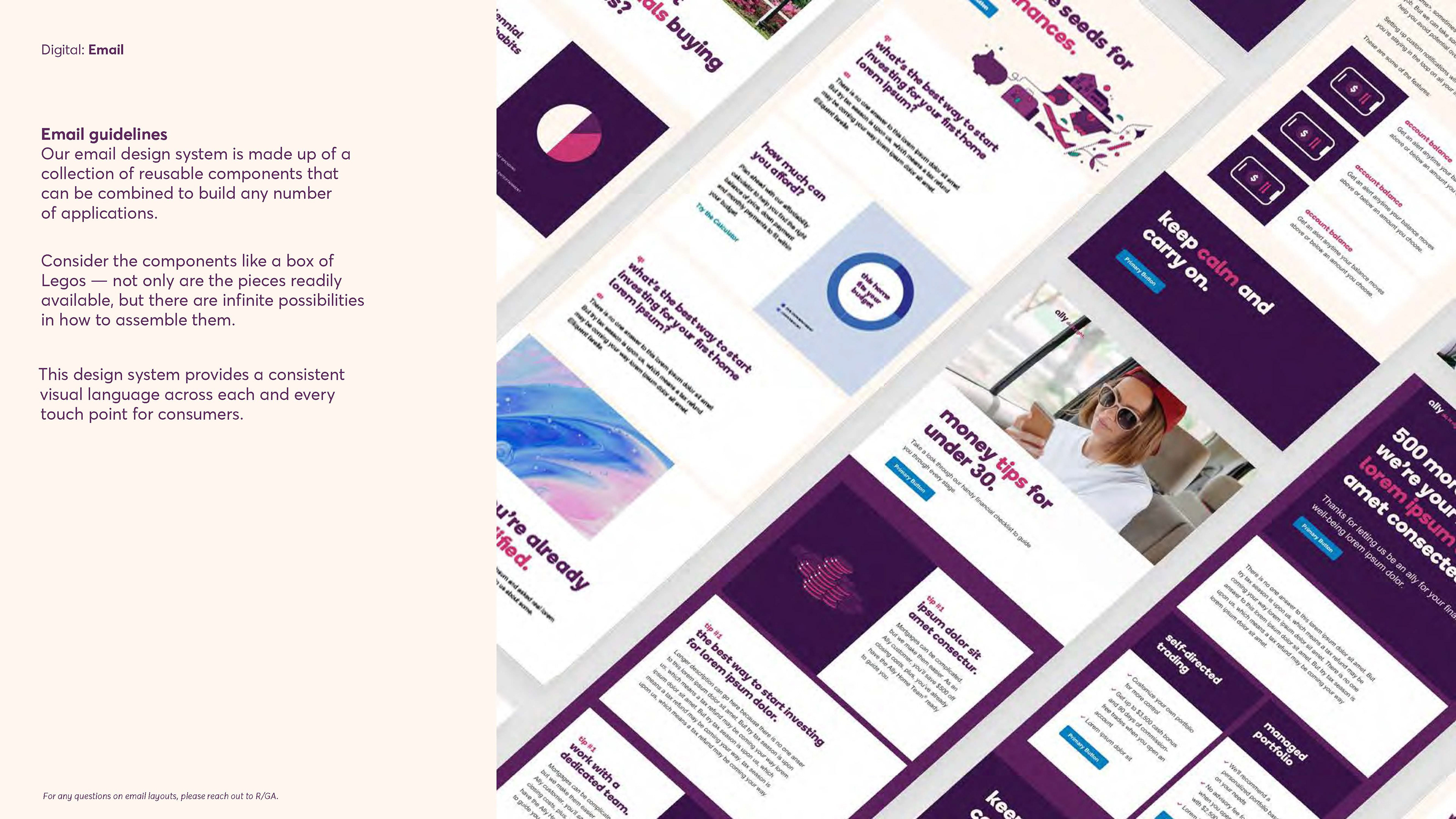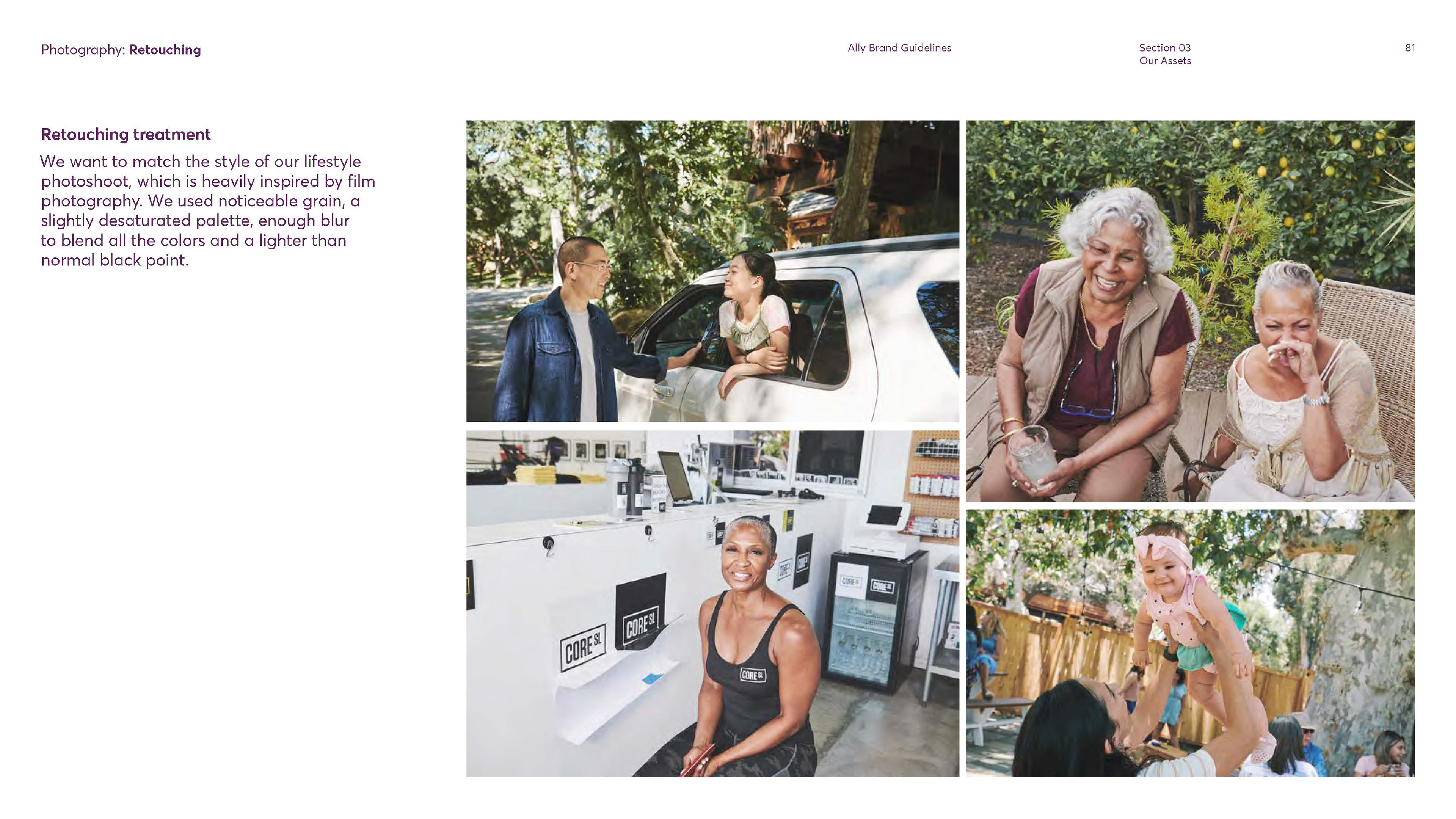 Brand guidelines for in-app product design, digital marketing, and advertising layout specifications for the digital-first banking service. Key integrations for this deck feature a photography asset library that leads you to any image in the client's DAM system with just a click.